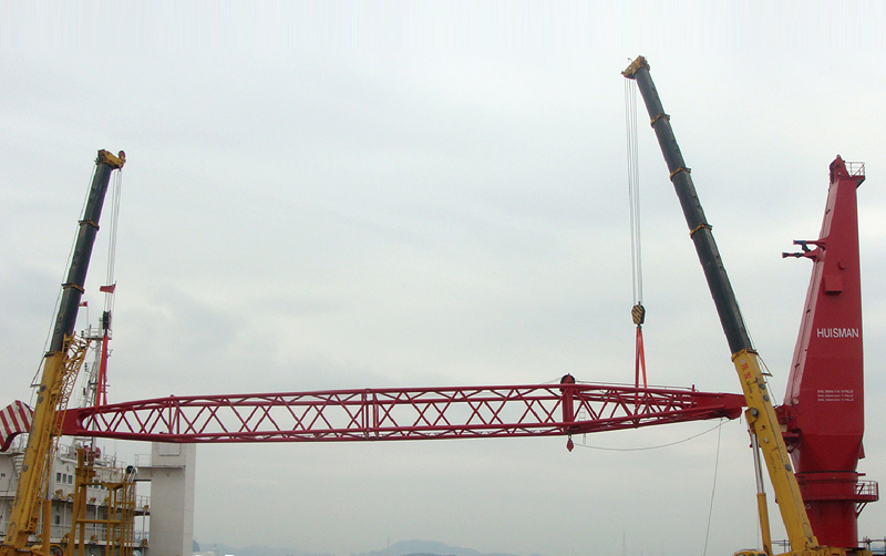 兩臺起重機在廈門港海上吊裝作業(yè)
